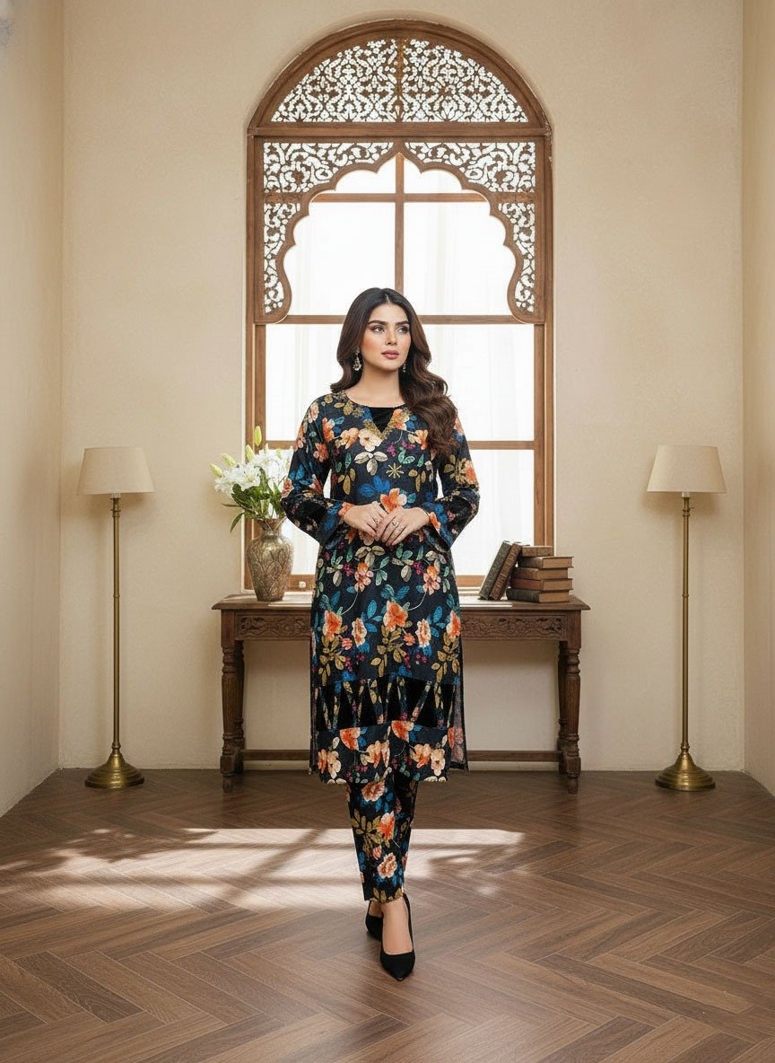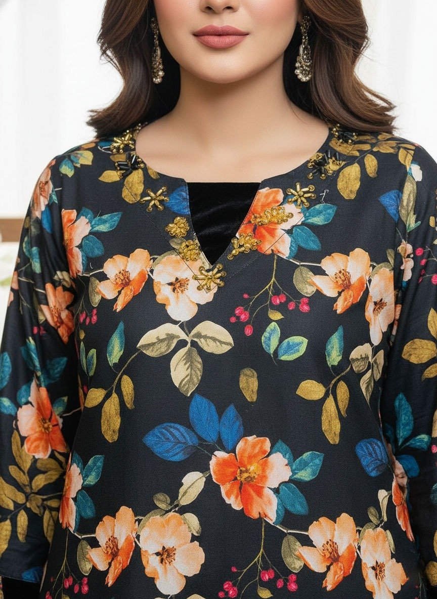 Shirt: Printed Khaddar with Velvet and Emblishment on Neckline