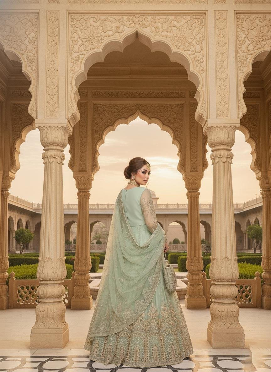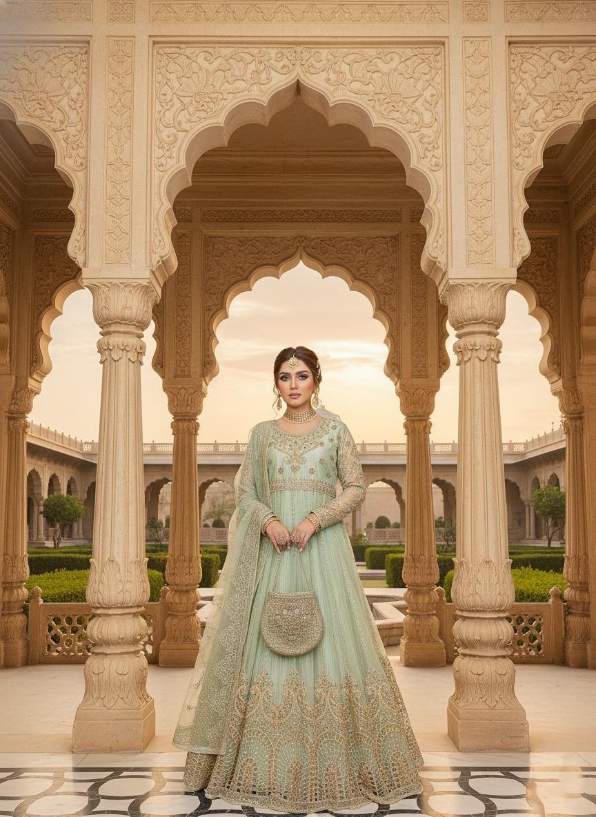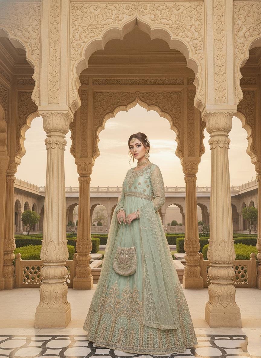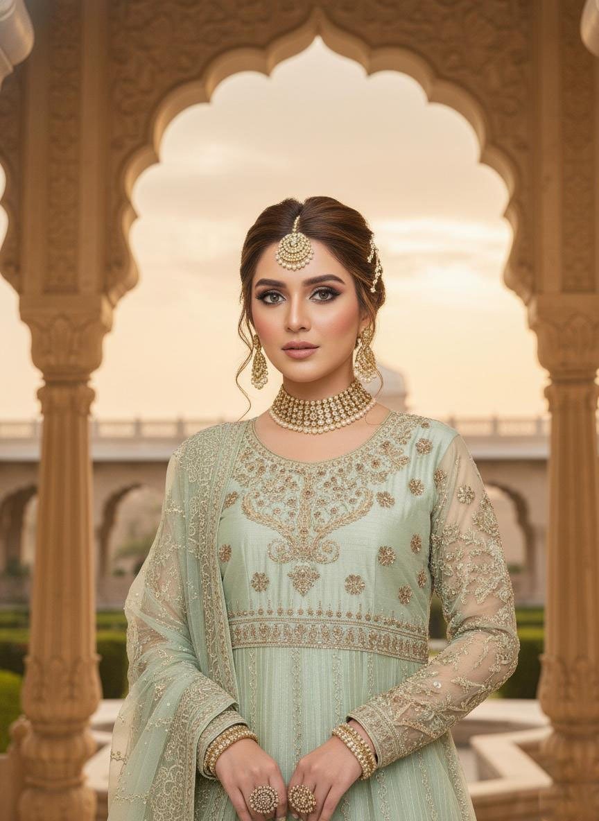 This exquisite ensemble is a celebration of intricate craftsmanship, combining hand adda work, delicate embroidery, and shimmering sequins throughout. The stylized neckline adds a contemporary touch to its traditional silhouette. Featuring detailed embroidery and sequins with prominent adda highlights, the design draws attention to the finely crafted main motifs on the panels. The panels are beautifully finished with id seams, enhancing the tailored structure.This timeless piece merges elegance with artisanal flair — perfect for festive occasions and special celebrations.