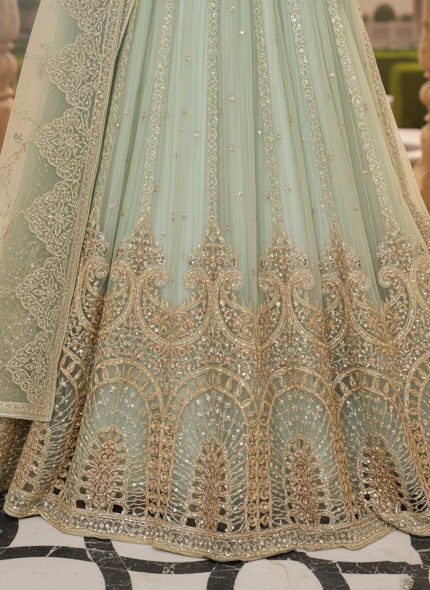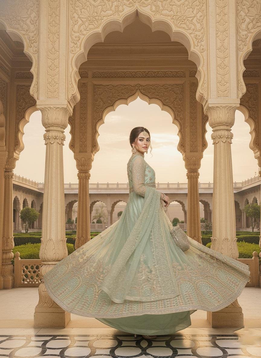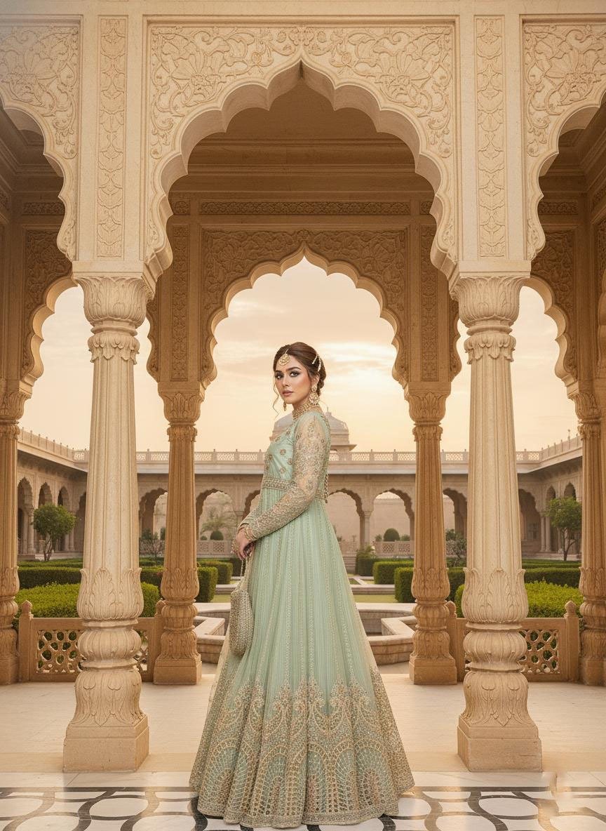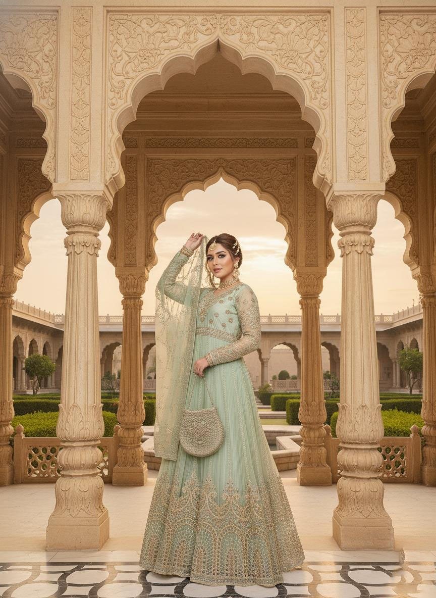 This exquisite ensemble is a celebration of intricate craftsmanship, combining hand adda work, delicate embroidery, and shimmering sequins throughout. The stylized neckline adds a contemporary touch to its traditional silhouette. Featuring detailed embroidery and sequins with prominent adda highlights, the design draws attention to the finely crafted main motifs on the panels. The panels are beautifully finished with id seams, enhancing the tailored structure.This timeless piece merges elegance with artisanal flair — perfect for festive occasions and special celebrations.