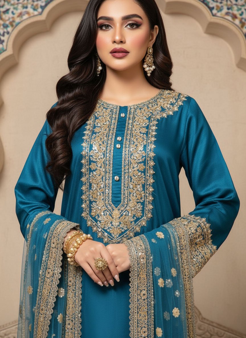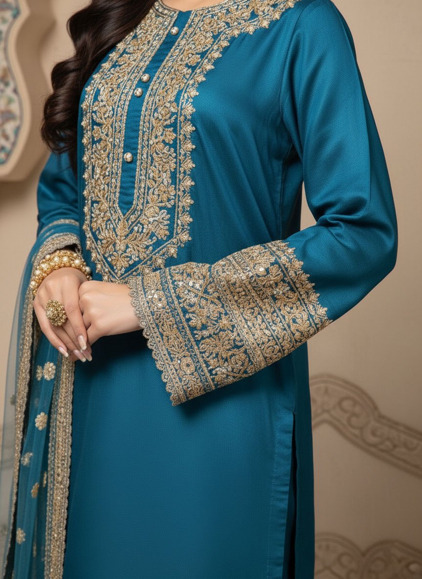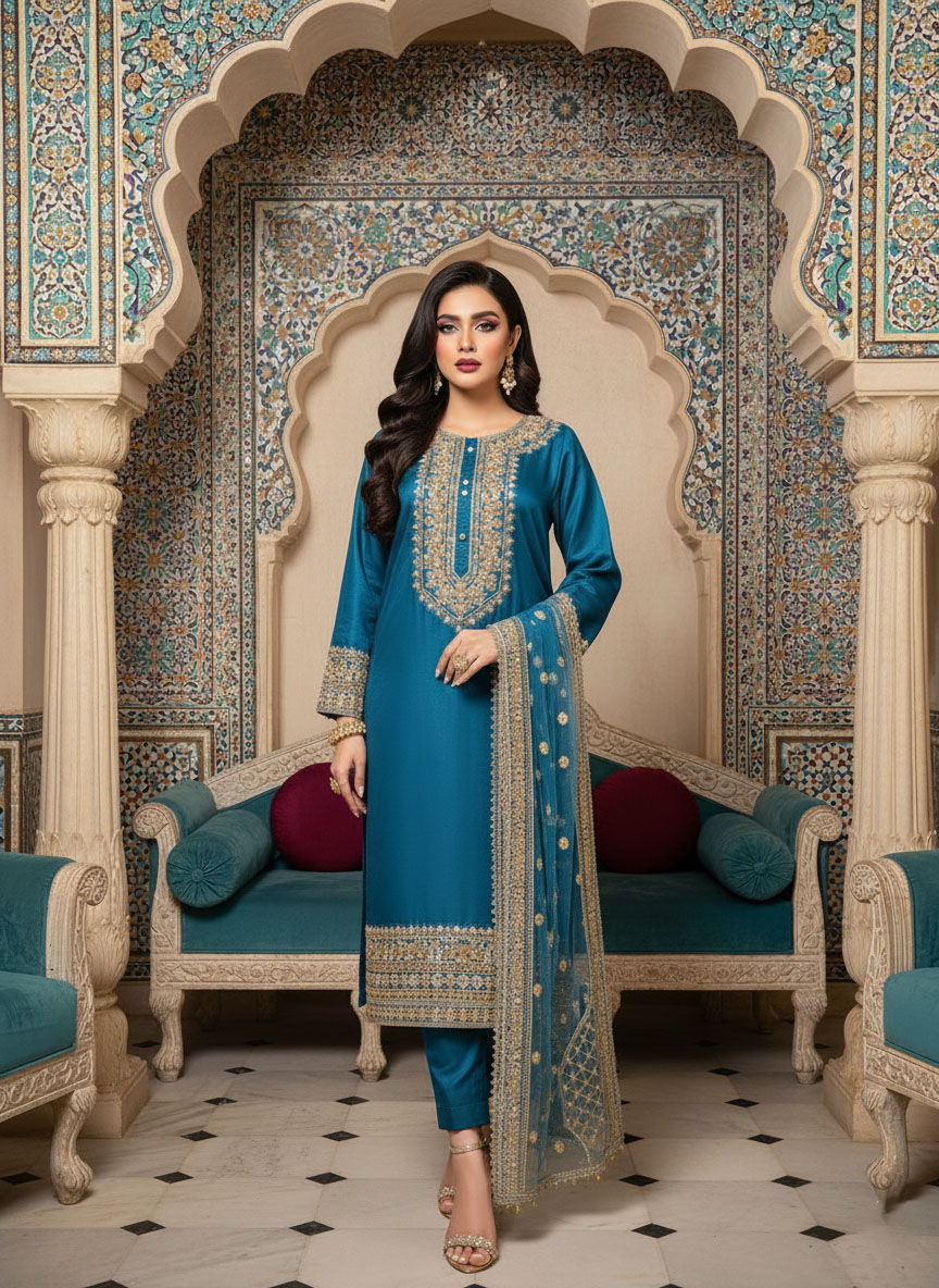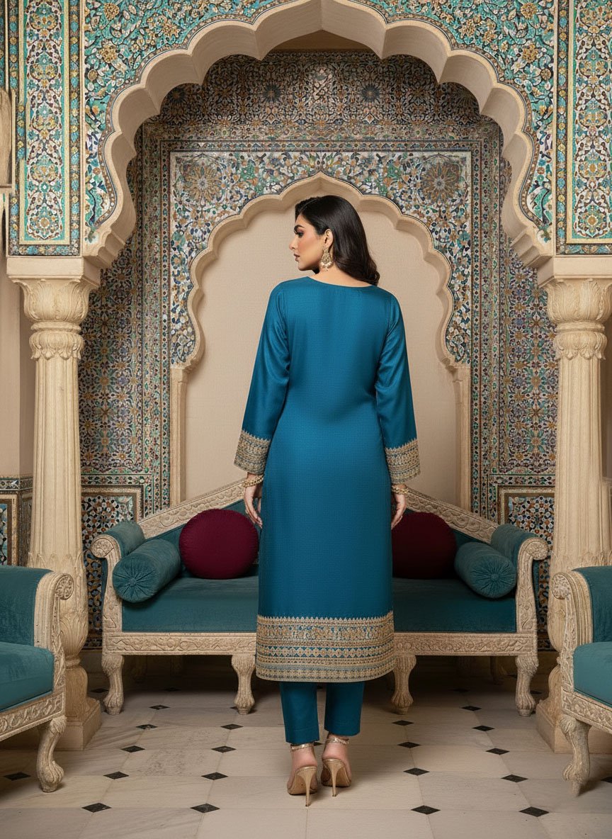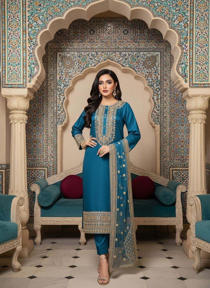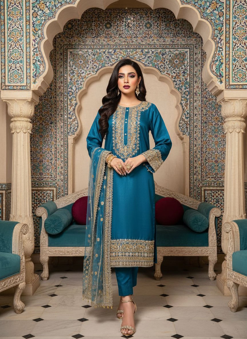 Crafted on a luxurious Zinc Blue canvas of fine Kattan silk, Esham manifests timeless luxury. The lustrous Long Shirt set is adorned with refin Neckline within delicately ornate arches gleaned from iconic Mughal inlay art on neck and motifs on sleeves and on border . Patterns of brimming floral vases are wrought by master craftsmen using hand techniques like zardosi, ,Stones ,Beats ,Motifs and dabka. Paired with a delicately hand crafted dupatta, Esham is symphony of grace and opulence.