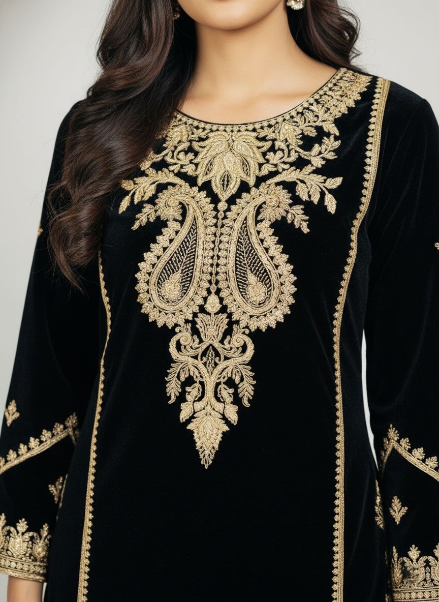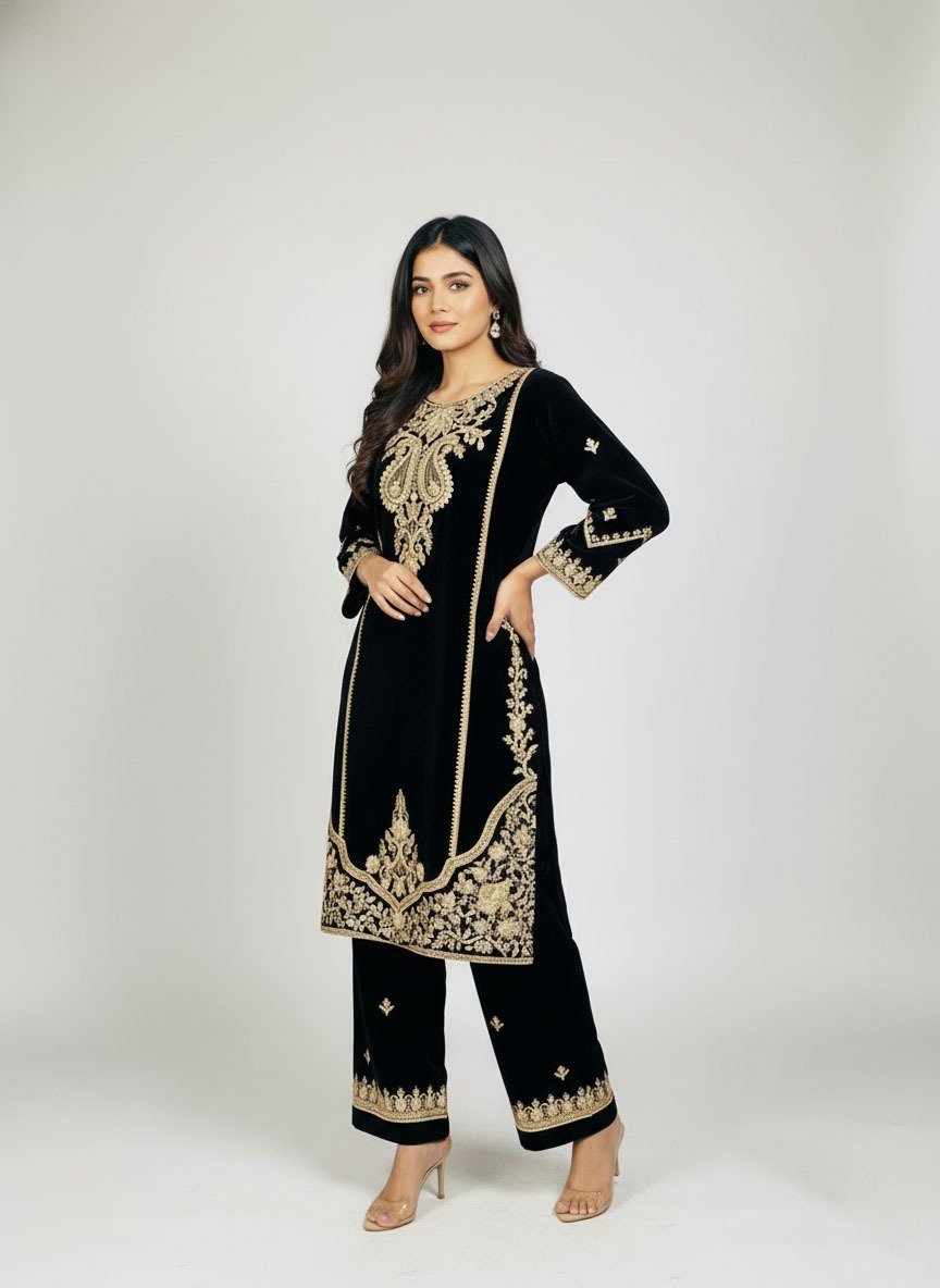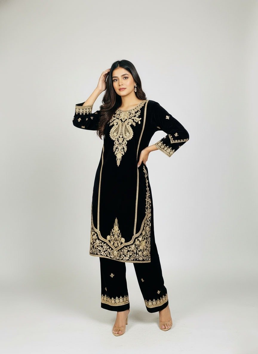 This elegant ensemble features a black velvet 2 piece beautifully adorned with intricate machine embroidery, sequins, and ada work. The design is enhanced with delicate hanging details on both the front and sleeves and trouser , creating a refined and graceful look. Paired with bell trousers with motifs on it, the outfit combines sophistication with comfort. The velvet shirt, tailored with a short slit and a stylish round hem, adds depth and richness to the overall design. Finished with a  neckline and contemporary bell sleeves, this outfit reflects timeless elegance with a modern edge, making it perfect for formal gatherings and festive occasions.