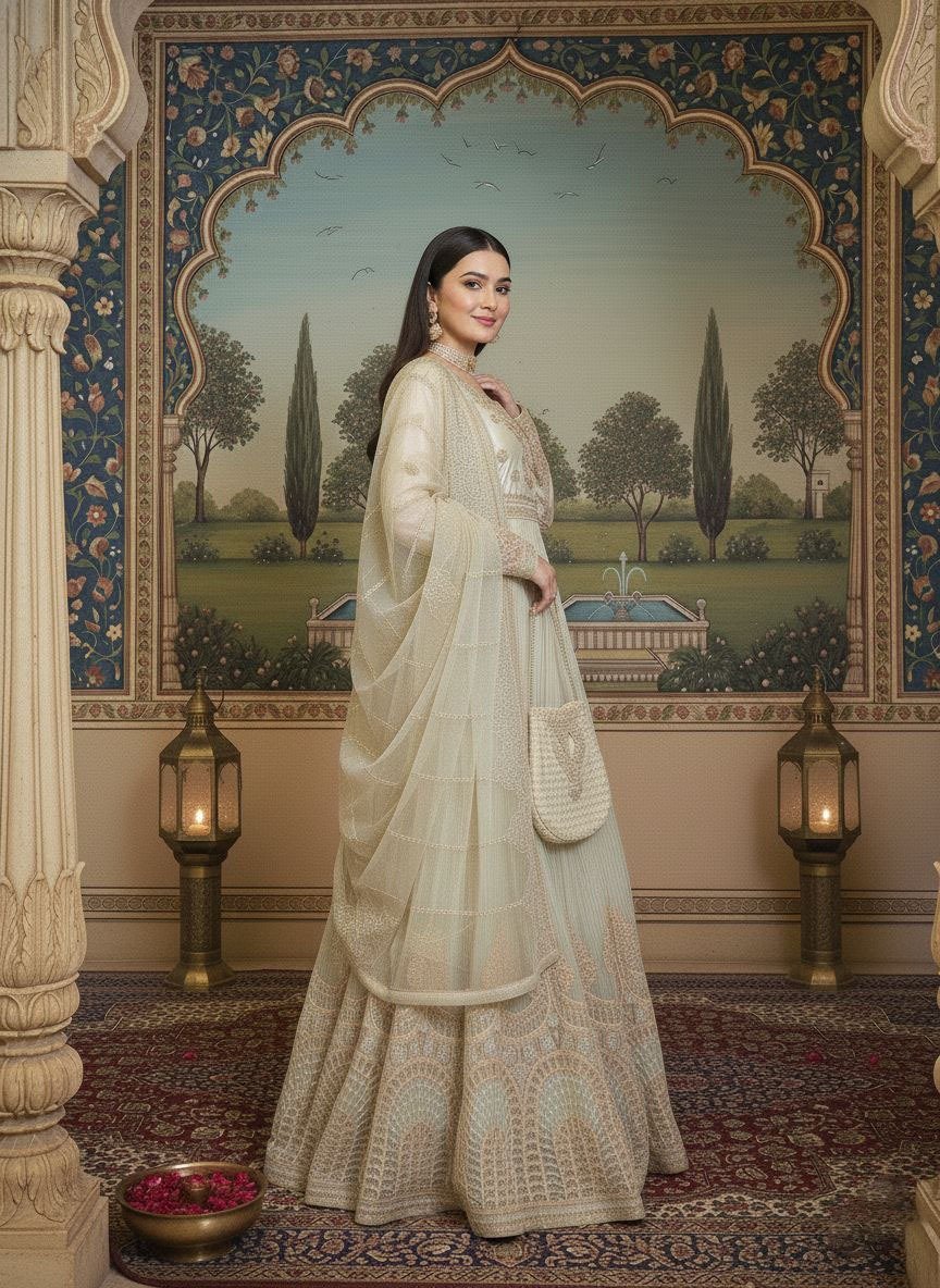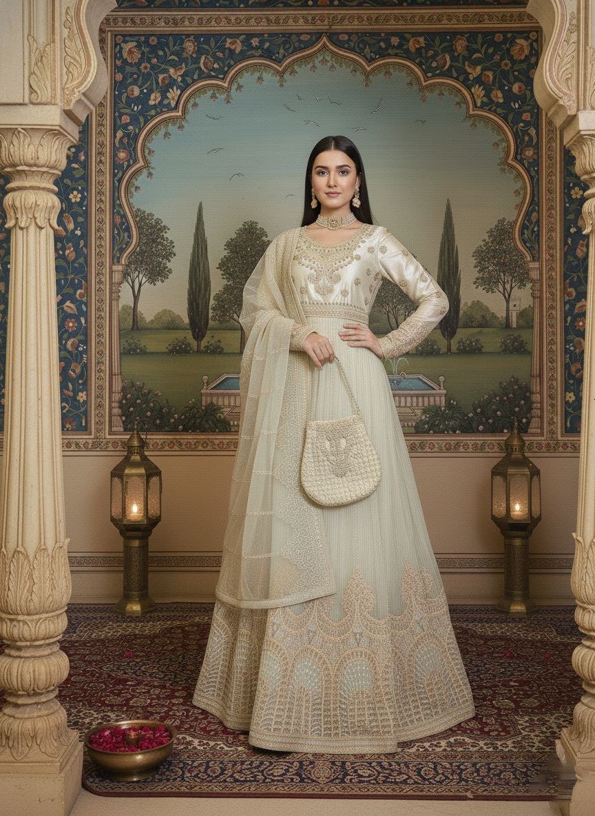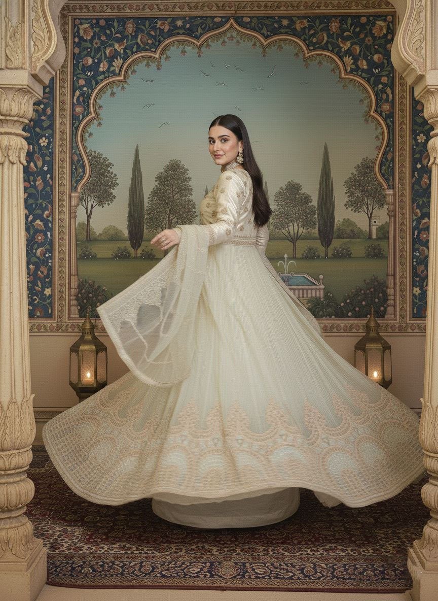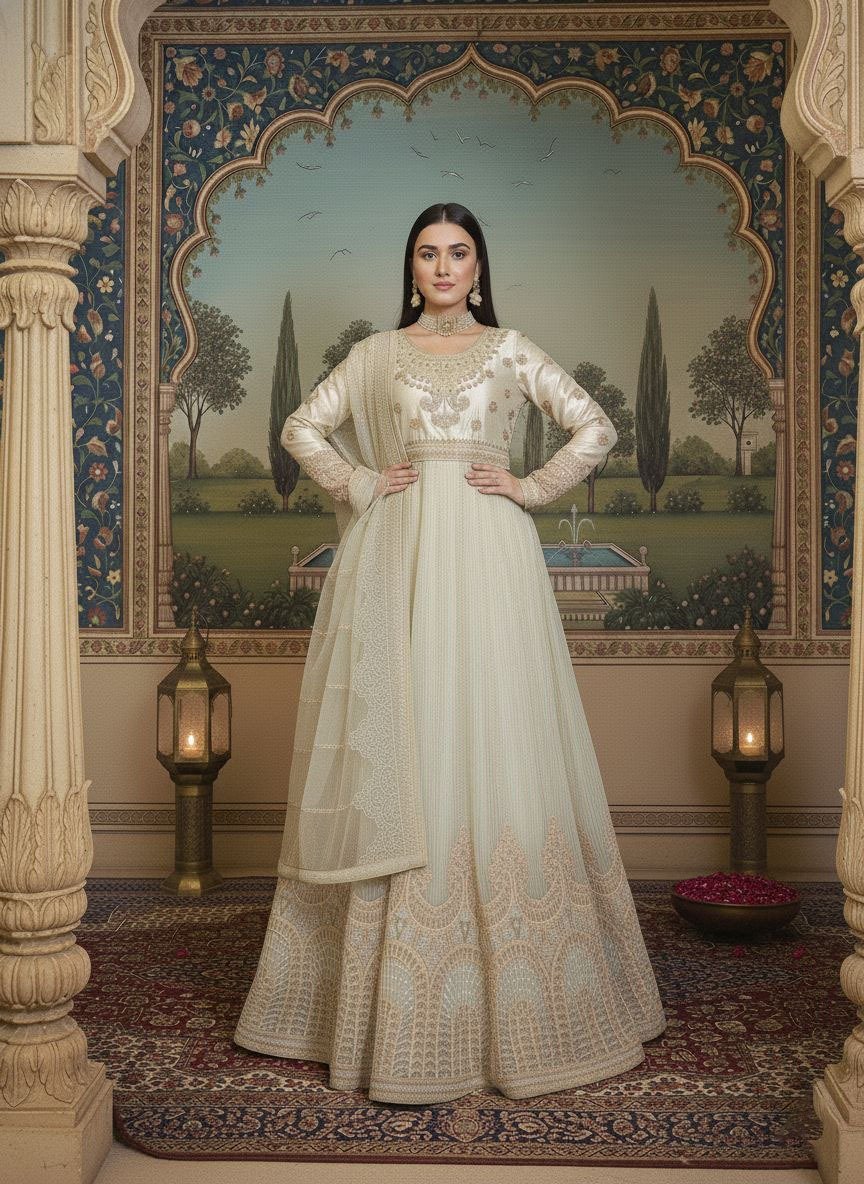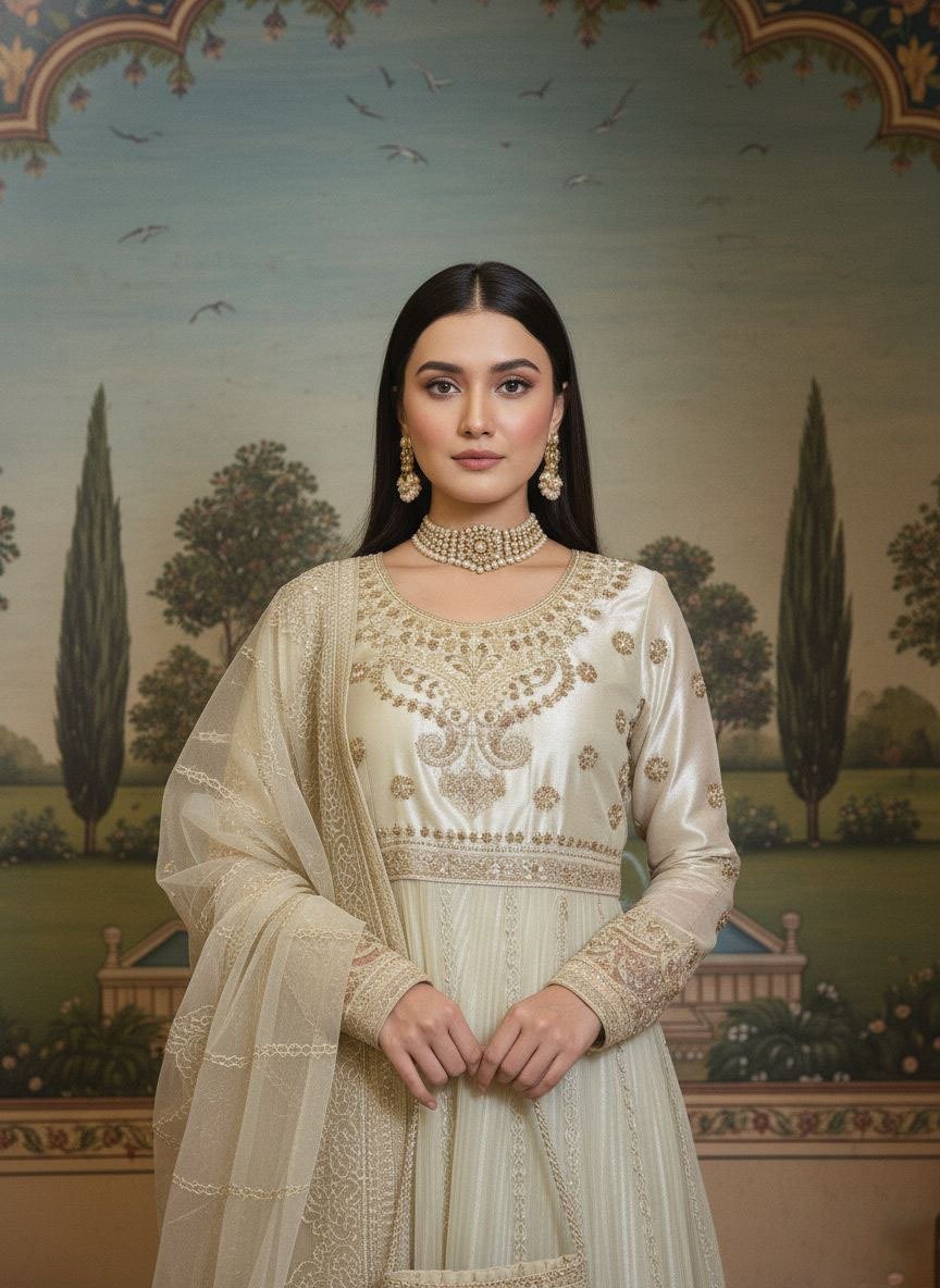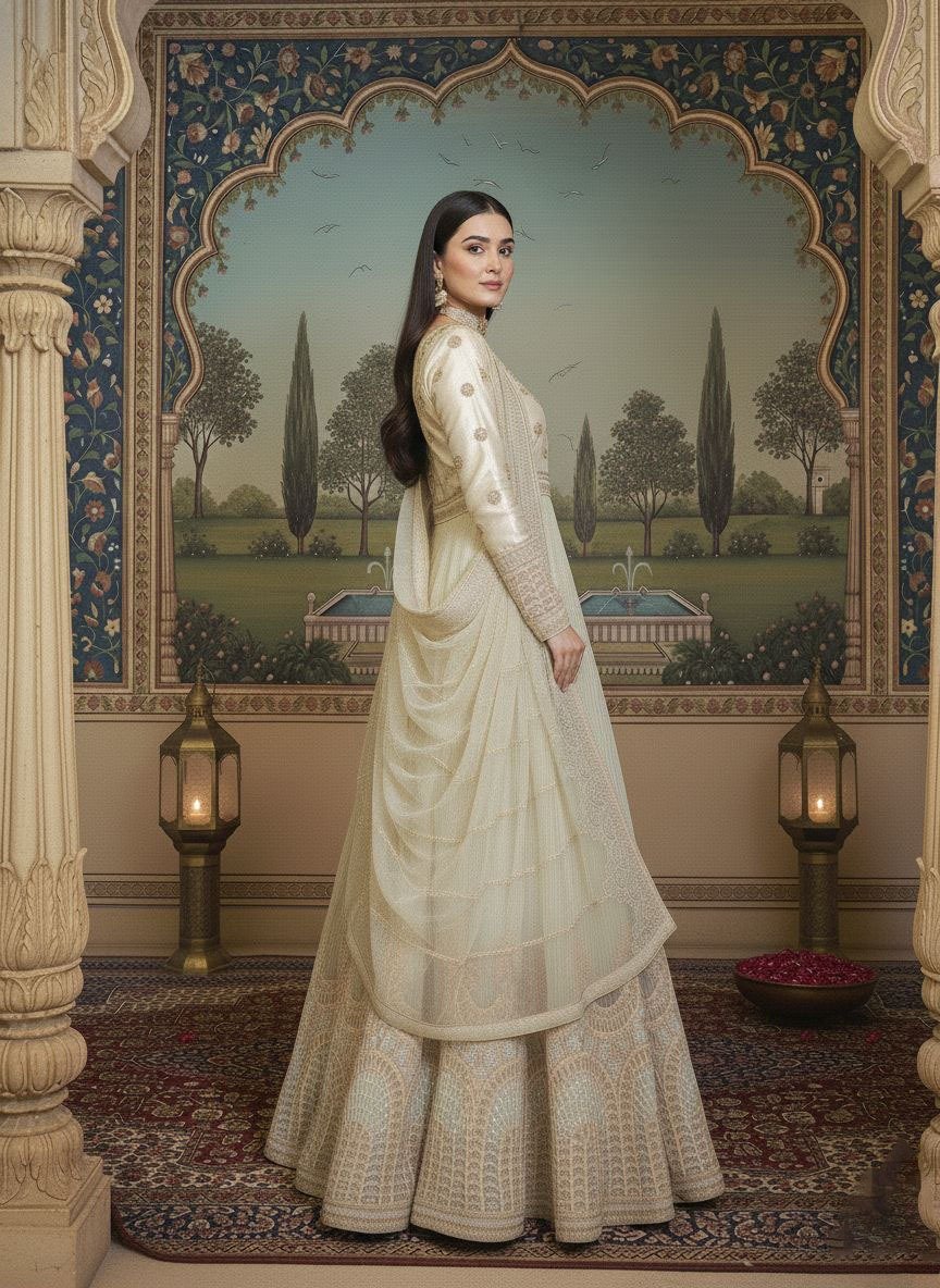 This exquisite ensemble is a celebration of intricate craftsmanship, combining hand adda work, delicate embroidery, and shimmering sequins throughout. The stylized neckline adds a contemporary touch to its traditional silhouette. Featuring detailed embroidery and sequins with prominent adda highlights, the design draws attention to the finely crafted main motifs on the  panels. The panels are beautifully finished with id seams, enhancing the tailored structure.This timeless piece merges elegance with artisanal flair — perfect for festive occasions and special celebrations.