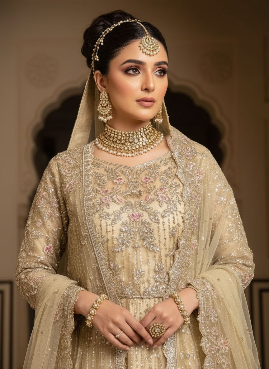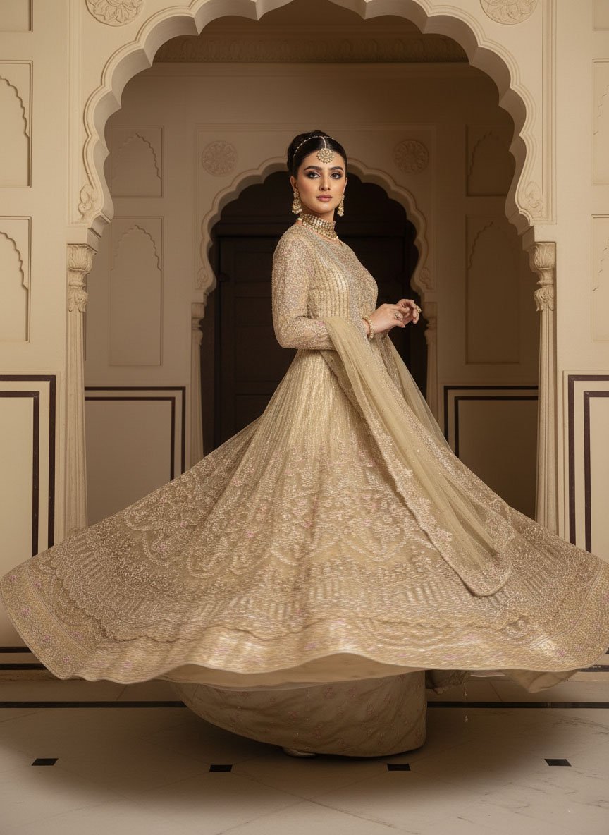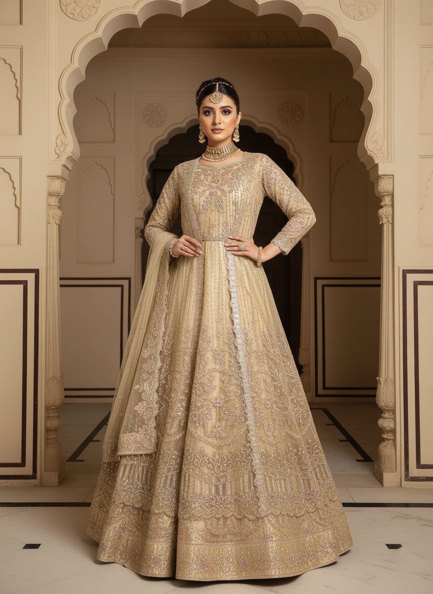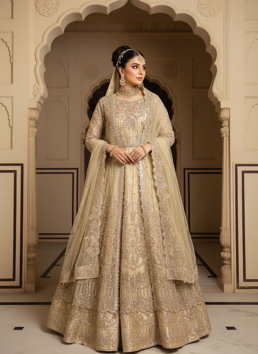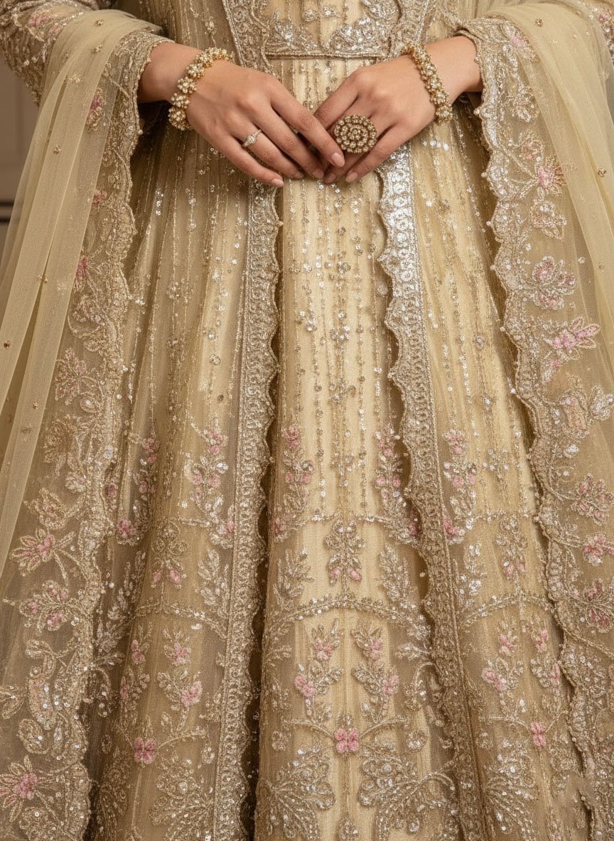 The Skin Golden lehnga with heavy emblished Gawn features modern reinterpretations of floral embroidery patterns using age-old techniques of naqshi and dabka with Stones. The lehnga and gawn is adorned in multicoloured motifs wrought using resham, pearls and hand-cut sequins. This ensemble is paired with an embellished net dupatta.